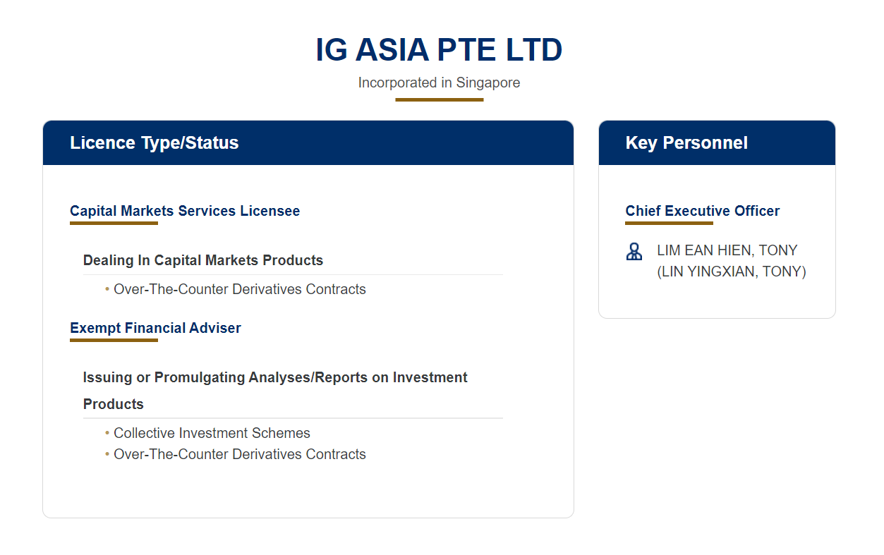 IG Asia Pte Ltd is the legal entity of IG in Singapore. It holds a CMS license (200510021K) issued by the Monetary Authority of Singapore (MAS). IG Asia Pte Ltd is authorized to offer over-the-counter derivatives contracts on various asset classes.